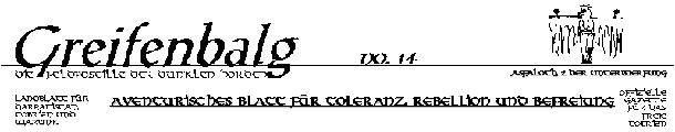 Mendena. Vor der Herzogenstadt wurden zu unserem Bedauern kürzlich zwei Mitarbeiter der GaBi aufgelesen. Die offensichtlich schwer verwirrten Personen, die auch äußerlich schwer gelitten hatten, lebten zum Erstau-nen aller noch und faselierten unzusammen-hängenden hanebüchenen Unsinn daher. Die beiden beschwerten sich insbesondere da-rüber, daß ihnen bei einem Überfall "wichtige Dokumente abhanden gekommen seien, als wenn dies nicht an der Tagesordnung sei. Eine Äußerung, die ob solcher Naivität nur ein all-gemeines mitleidiges Kopfschütteln erntete. Auf die weitere Nachfrage, um welche Art von Papieren es sich hierbei handele, schwiegen sie sich jedoch beharrlich und mit mürrischen Gesichtszügen aus. Zumindest hellten sich ihre Mienen wieder ein wenig auf, als sich herausstellte, daß sich die Mitschrift des Interviews mit den Greifenbalg-Redakteuren Janus Tigerkralle und Wollo Wallach noch in ihrem Besitz befand. |